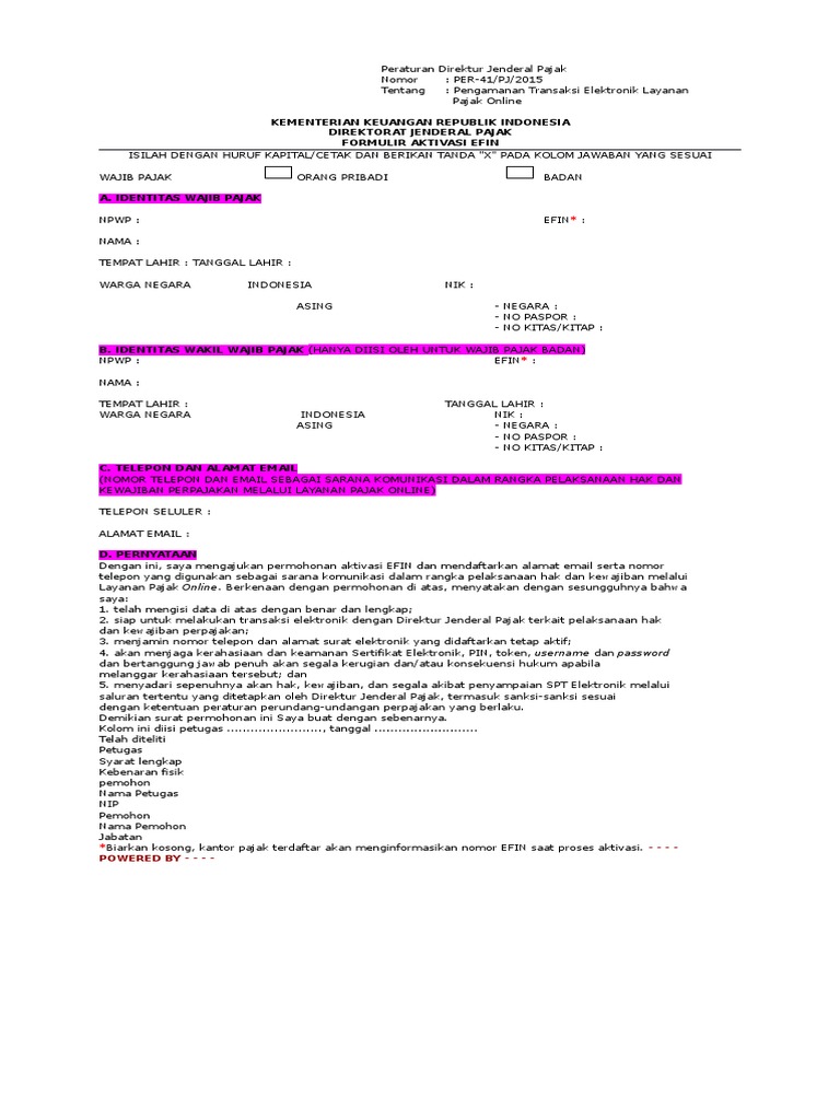 10+ Download Formulir Efin Word. Formulir aktivasi efin isilah dengan huruf kapital/cetak dan berikan tanda x pada kolom jawaban yang sesuai. Setelah mengunduh dan mengisi formulir yang ditentukan untuk mendaftar efin, wajib pajak kemudian membawa download formulir terlebih dahulu;