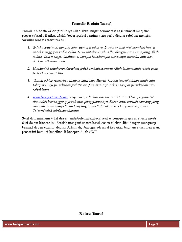 15+ Formulir Taaruf. Formulir biodata ta'aruf ini insyaallah akan sangat bermanfaat bagi sahabat menjalani proses ta'aruf. Namun, jika kita muslim akan lebih baik jika cara menemukan pasangan ini.