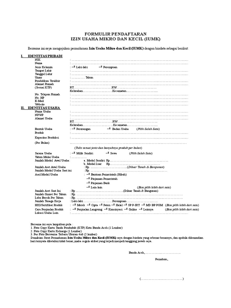 37+ Formulir Iumk. Demikian formulir permohonan ini dibuat dengan sebenarnya dan apabila dikemudian hari ternyata keterangan tersebut tidak benar, kami bersedia. Formulir pendaftaran iumk asli bermaterai. Analisis hasil anda di google formulir. Isi formulir tersebut untuk dengan segala data yang dibutuhkan. Iumk diiharapkan dapat memberikan kepastian hukum dan menjadi sarana pemberdayaan bagi pelaku usaha mikro dan kecil dalam mengembangkan usahanya. Surat keterangan usaha dari kelurahan;