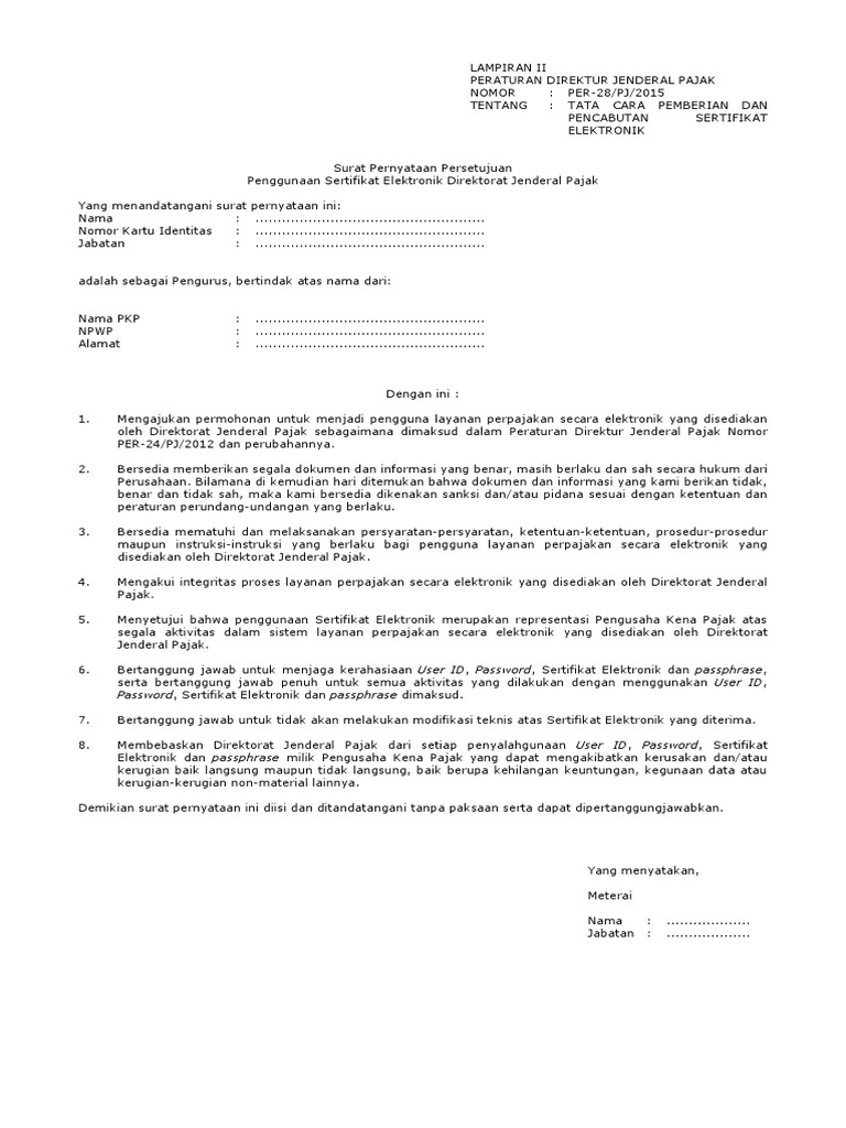 29+ Form Surat Permintaan Sertifikat Elektronik Per-28/Pj/2015. Surat permintaan sertifikat elektronik dan surat pernyataan persetujuan penggunaan sertifikat elektronik ditandatangani dan disampaikan oleh pengurus pkp yang bersangkutan secara langsung ke kpp tempat pkp dikukuhkan dan tidak diperkenankan untuk dikuasakan ke pihak lain. Tata cara pemberian dan pencabutan sertifikat surat pernyataan persetujuan penggunaan sertifikat elektronik direktorat jenderal pajak.